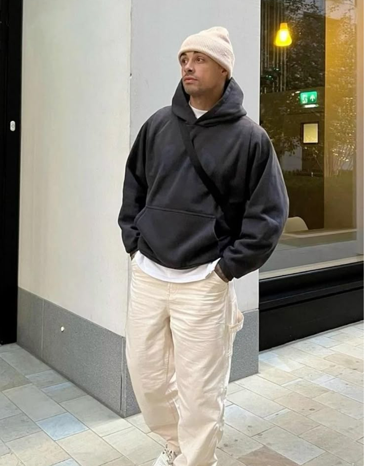 • Men: Boxy white tee + gray hoodie + straight-leg denim + white sneakers = timeless street chic.