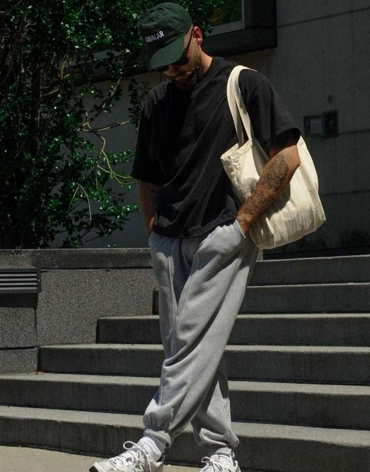 • Black relaxed trousers or faded denim